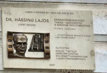 Születésének 100. évfordulóján emléktáblát avatott Hársing Lajos irodalmár, író, műfordító és szinkrondramaturg, a Kossuth Lajos Tudományegyetem egykori hallgatója tiszteletére Újbuda Önkormányzata és a Debreceni Egyetem Bölcsésztudományi Kara. A domborművet Budapesten, egykori lakóházának falán a családtagok, barátok, tanítványok, tisztelők jelenlétében leplezték le november 9-én.